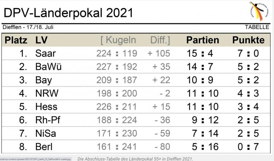 Der letzte Spieltag der SBV-Liga 2022 ist beendet. In der Landesliga konnte sich der BC Saarlouis 1 mit 7:2 Siegen und 30:15 Spielen vor dem FV Diefflen 1 mit ebenfalls 7:2 Siegen und 28:17 Spielen die Meisterschaft sichern. Der BC Saarlouis wird somit an der Aufstiegsrunde zur DPV-Bundesliga am 06. und 07. November in Gersweiler teilnehmen. Dritter der diesjährigen Landesliga wurde der BC Saarwellingen mit 6:3 Siegen und 23:22 Spielen. Abgestiegen in die Oberliga sind PC Messidor 1 und BC Bliesen-Winterbach 1.
