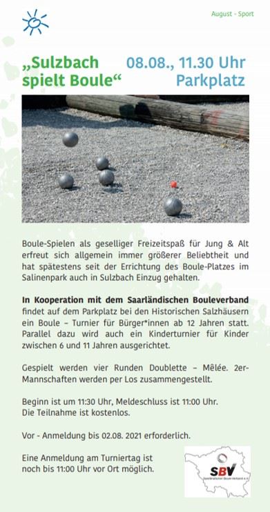 Im Rahmen des Breitensportkonzeptes des Saarländischen Boule-Verbandes findet am 08.08.2021 ein Bouleturnier für Freizeit- und Hobbyspieler, Einsteiger und Kinder statt. Das Turnier ist offen.