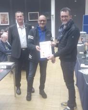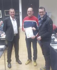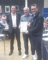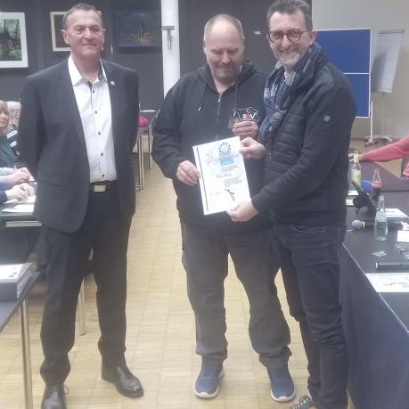 Das Turnier wird durch den SBV unterstützt. Als Vertreter des SBV übergab Vorstandsmitglied Uwe Racz Boule-Ringe, Medaillen, Schweinchen, SBV-Wimpel und ein Gastgeschenk an Frank Sahner.