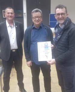 Mit diesen Worten übergab das Vorstandsmitglied des SBV, Thomas Schumann ein Jubiläumspräsent mit SBV Wimbel an den Vorsitzenden Wolfgang Heblich des PC Hanweiler. Zur Unterstützung des Hobby-Turnier wurden Boule-Ringe, Medaillen & SBV Zielkugeln an den Vorstand des PC Hanweiler übergeben.