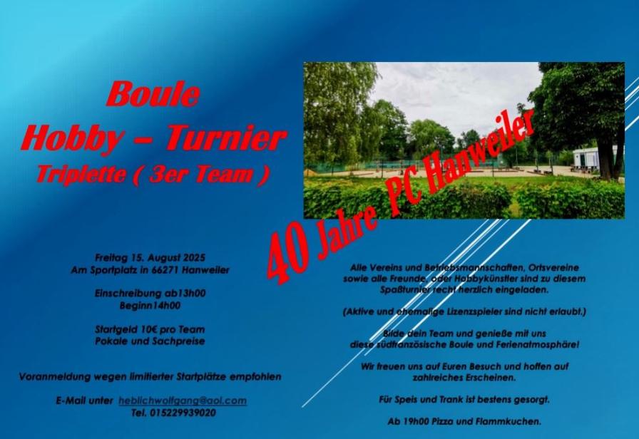 Am Samstag, 30.08.2025 findet in St. Wendel der 1. Ostertal-Cup für Hobbybouler statt. Ausrichter auf der Bouleanlage auf dem Buberg/Bubach ist die Boulespiel-Gemeinschaft St. Wendel. Meldeschluss ist um 10:30 Uhr. Es werden 5 Spiele "Doublette" im Schweizer System durchgeführt.